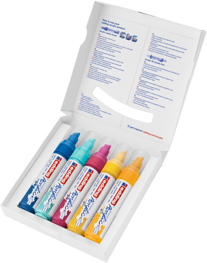 Aukštos kokybės akriliniai dažai greitai džiūsta, išdžiūvę tampa atsparūs vandeniui ir blukimui, garantuodami jūsų kūrinių ilgaamžiškumą. Šių universalių meno reikmenų panaudojimas yra platus – jais galima tapyti ant drobės, medžio, akmens, kartono, metalo ir daugelio kitų paviršių. Mėgaukitės patogumu ir lengvumu darbe, kurdami tikrus šedevrus su „Edding“ akriliniais žymekliais. Pasitikėkite vokiečių meistriškumu ir kokybe, užtikrinančia patikimą veikimą ir puikius meninius rezultatus.