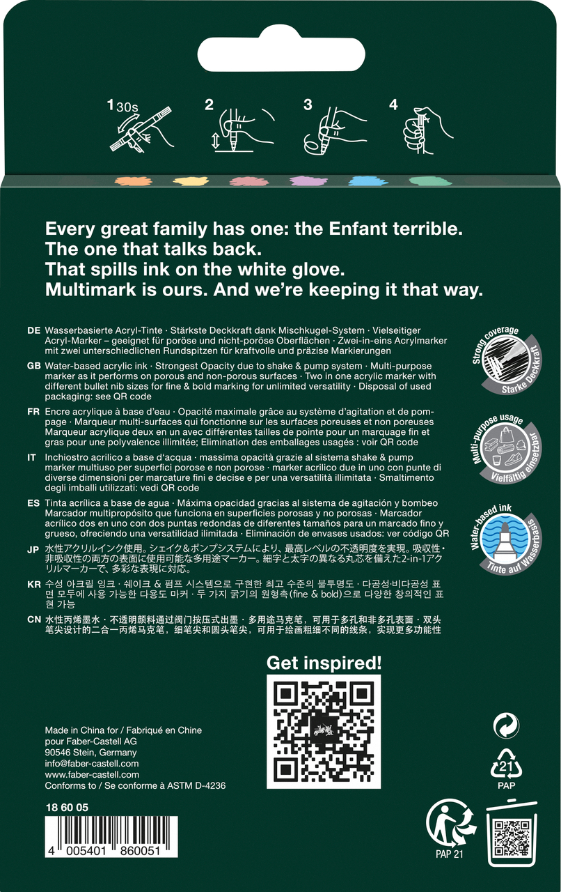 Nesvarbu, ar personalizuojate aksesuarus, dekoruojate namų apyvokos daiktus, ar pridedate ryškių detalių savo meno kūriniams, šie akriliniai markeriai užtikrina sklandžią, nepermatomą spalvą ir puikų padengimą. „Multimark“ serija išsiskiria savo suderinamumu su įvairiais paviršiais, leidžiančiu dirbti su plačiu medžiagų spektru, įskaitant popierių, drobę, medį, akmenį, metalą ir daugelį kitų.