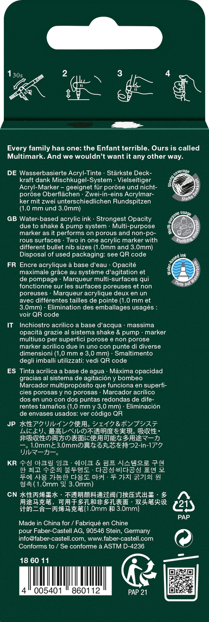 Patirkite aukščiausią kokybę, kuri yra Faber-Castell prekės ženklo sinonimas. „Multimark“ serija garantuoja sklandų tepimą ir nepermatomas linijas, leidžiančias pasiekti ryškių detalių ir drąsių akcentų. Pagrindiniai juodos ir baltos spalvų atspalviai puikiai tinka kurti stiprius kontrastus, plonus kontūrus arba pridėti šviesos ir šešėlių prie jūsų projektų. Šie tvirti akriliniai rašikliai suteikia jums galimybę užtikrintai atlikti platų meninių ir praktinių užduočių spektrą, žinant, kad jūsų darbai atlaikys laiko išbandymą.