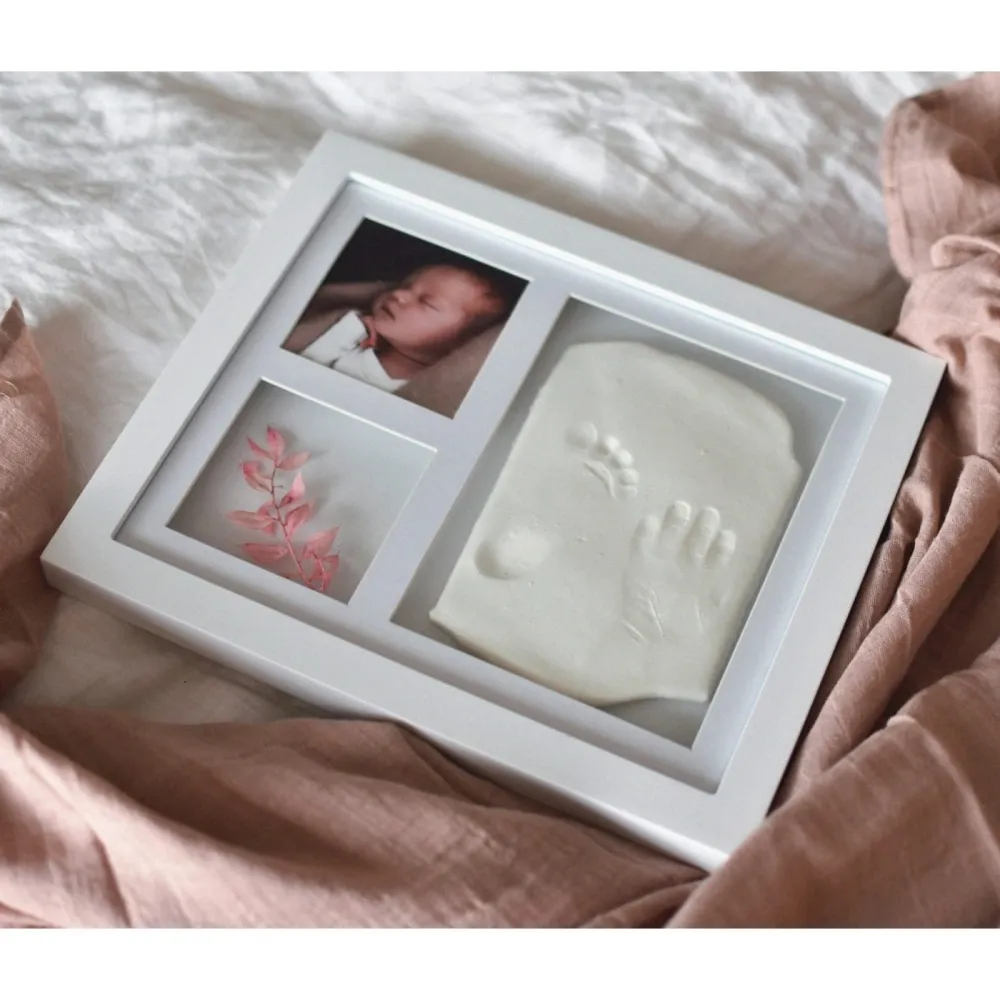 Baltas rėmelis su kūdikio rankos/pėdos įspaudu.