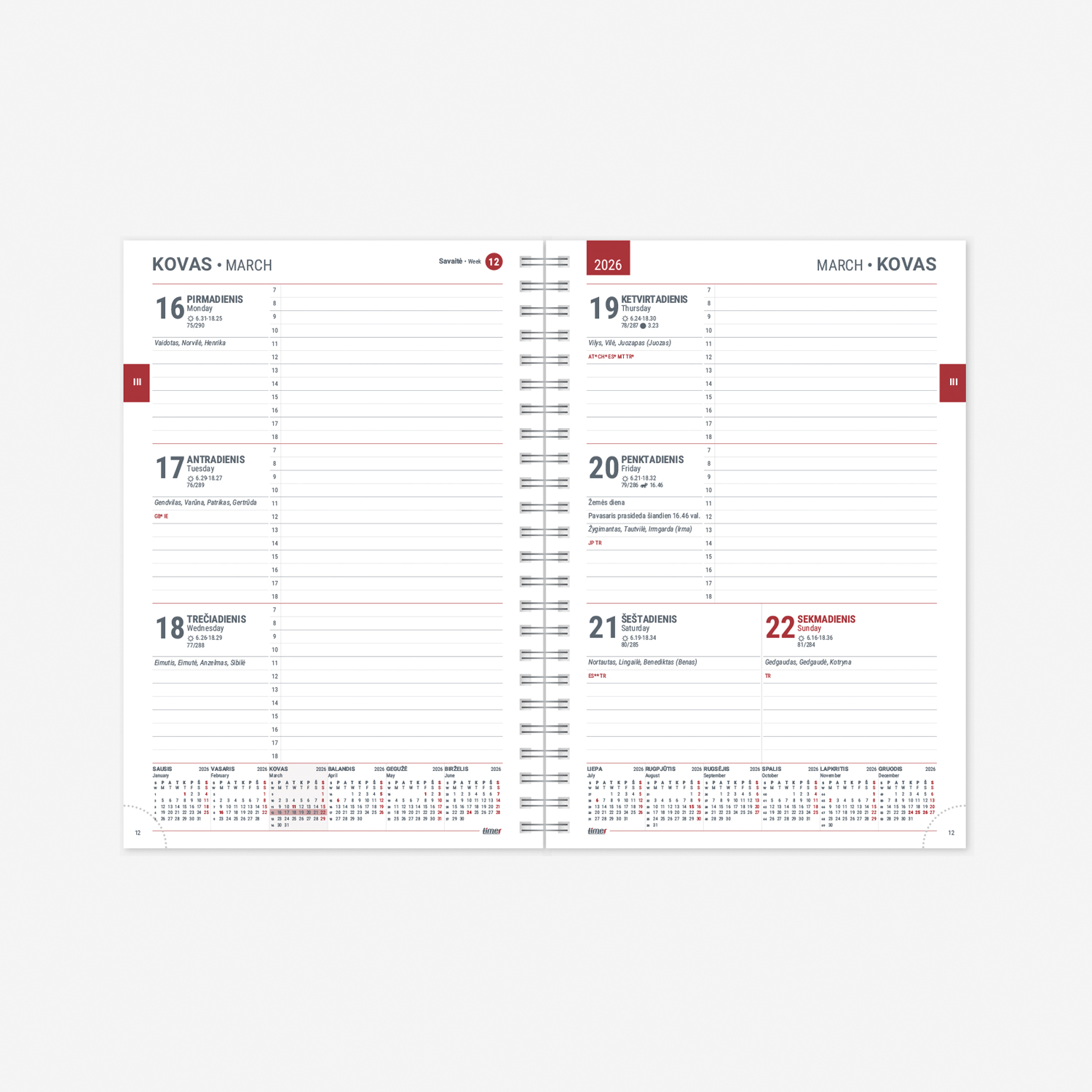 • Darbo kalendorius • Skirtas detaliam darbų ir susitikimų planavimui • A5 formato • Matmenys: 155 x 217 mm • Minkštos dirbtinės odos viršelis, į kurį įdedamas kalendorius – viršelį galėsite naudoti ir kitais metais, tereikės įsigyti kalendoriaus papildymą • Viršelis su gumele • Atvarte yra kišenėlė telefonų knygelei, taip pat 2 skyreliai vizitinėms kortelėms, specialus laikiklis rašikliui • Kalbos: lietuvių, anglų • Susegtas spirale • Kiekviename atvarte visų metų kalendorius • Perforuoti lapų kampai • Priedai: keičiama telefonų knygelė, Lietuvos žemėlapis • Yra informaciniai puslapiai, metinis planas, papildomi puslapiai užrašams
