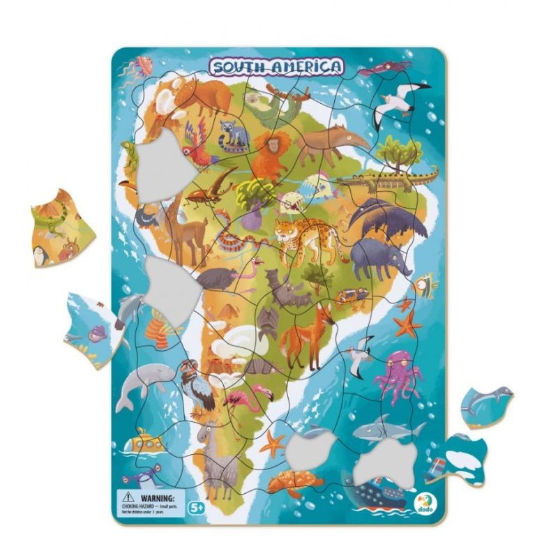 Dodo dėlionė Pietų Amerika (53 det.). Dėlionė vaikams susideda iš skirtingų, netaisyklingos formos detalių, turi pagrindą ir rėmelį. Dėliodami taip pat galėsite susipažinti su žemynui būdingais gyvūnais.