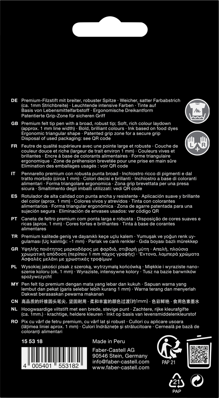 Faber-Castell Grip Boldpen tušinukai sukurti atsižvelgiant į ergonomiką, kad užtikrintų maksimalų komfortą net ilgai naudojant. Unikali „Grip“ rankenos zona neleidžia pirštams slysti, mažina rankos nuovargį ir garantuoja patikimą rašiklio valdymą. Mėgaukitės lengvu rašymu ir turtinga spalvų palete, kuri įkvėps naujoms idėjoms ir padės susisteminti informaciją naudojant spalvų kodavimą.