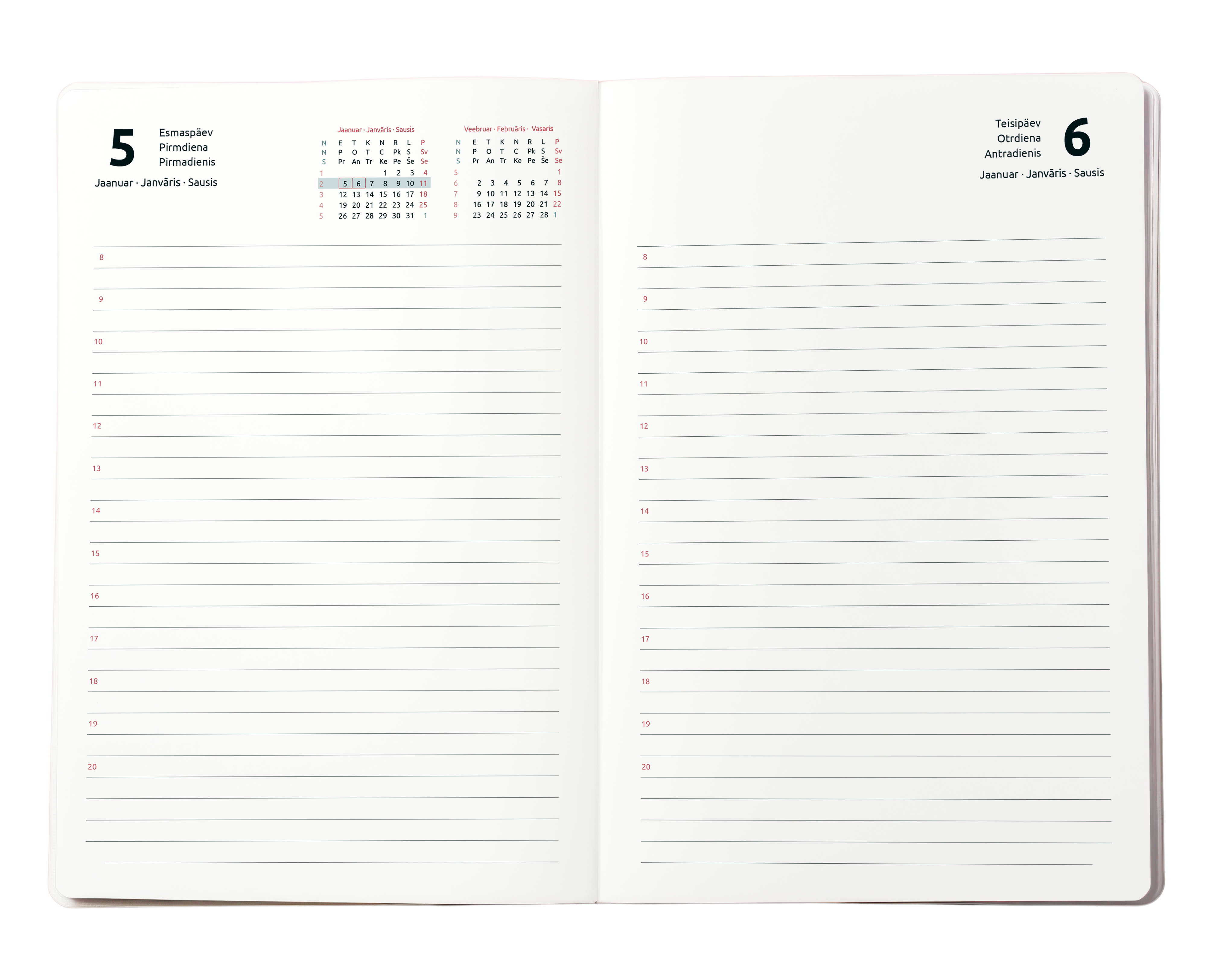Šis „Arkona” dienos planuoklis yra praktiško A5 formato, todėl jį patogu nešiotis bet kurioje rankinėje ar kuprinėje, užtikrinant, kad jūsų planai visada būtų po ranka. 2026 metams skirtas „diena puslapyje” išdėstymas suteikia daug vietos detaliems užrašams, susitikimams, terminams ir kasdieniams tikslams, padedant kruopščiai suplanuoti visus metus į priekį. Dėl jo apgalvotos struktūros galėsite lengvai stebėti užduotis, kontroliuoti eigą ir tiksliai valdyti savo laiką.