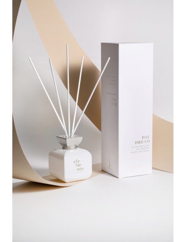 • Balta minimalistinė, išskirtinio dizaino pakuotė talpina 100 ml baltą buteliuką su dailia platinos spalvos dekoro detale bei baltomis lazdelėmis (10 vnt.), surištomis kaspinėliu.