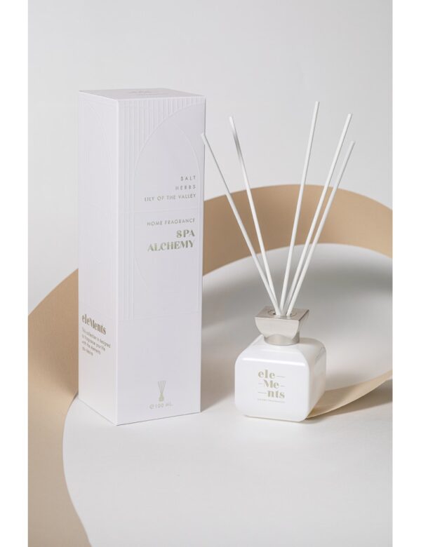 • Balta minimalistinė, išskirtinio dizaino pakuotė talpina 100 ml baltą buteliuką su dailia platinos spalvos dekoro detale bei baltomis lazdelėmis (10 vnt.), surištomis kaspinėliu.