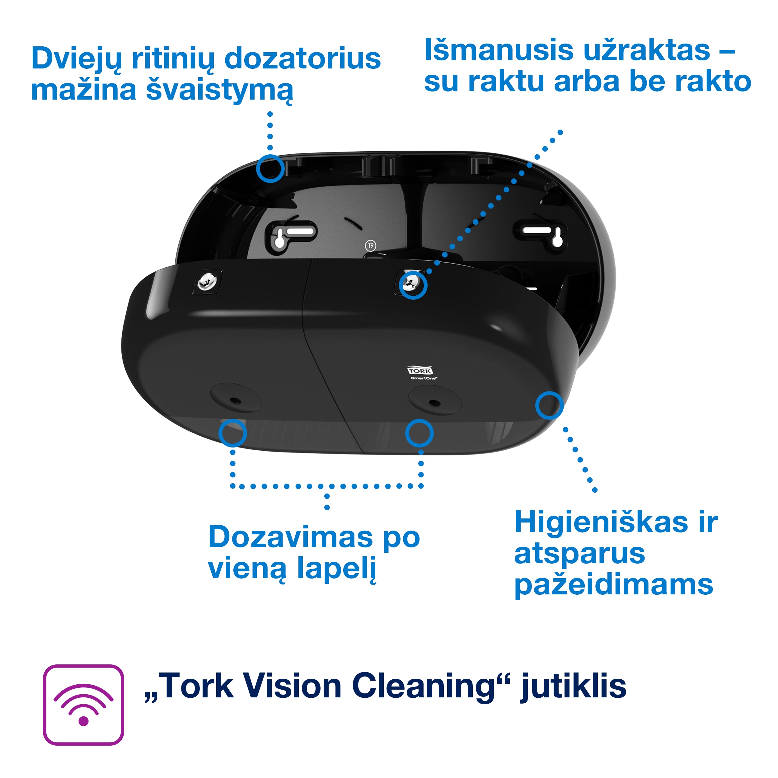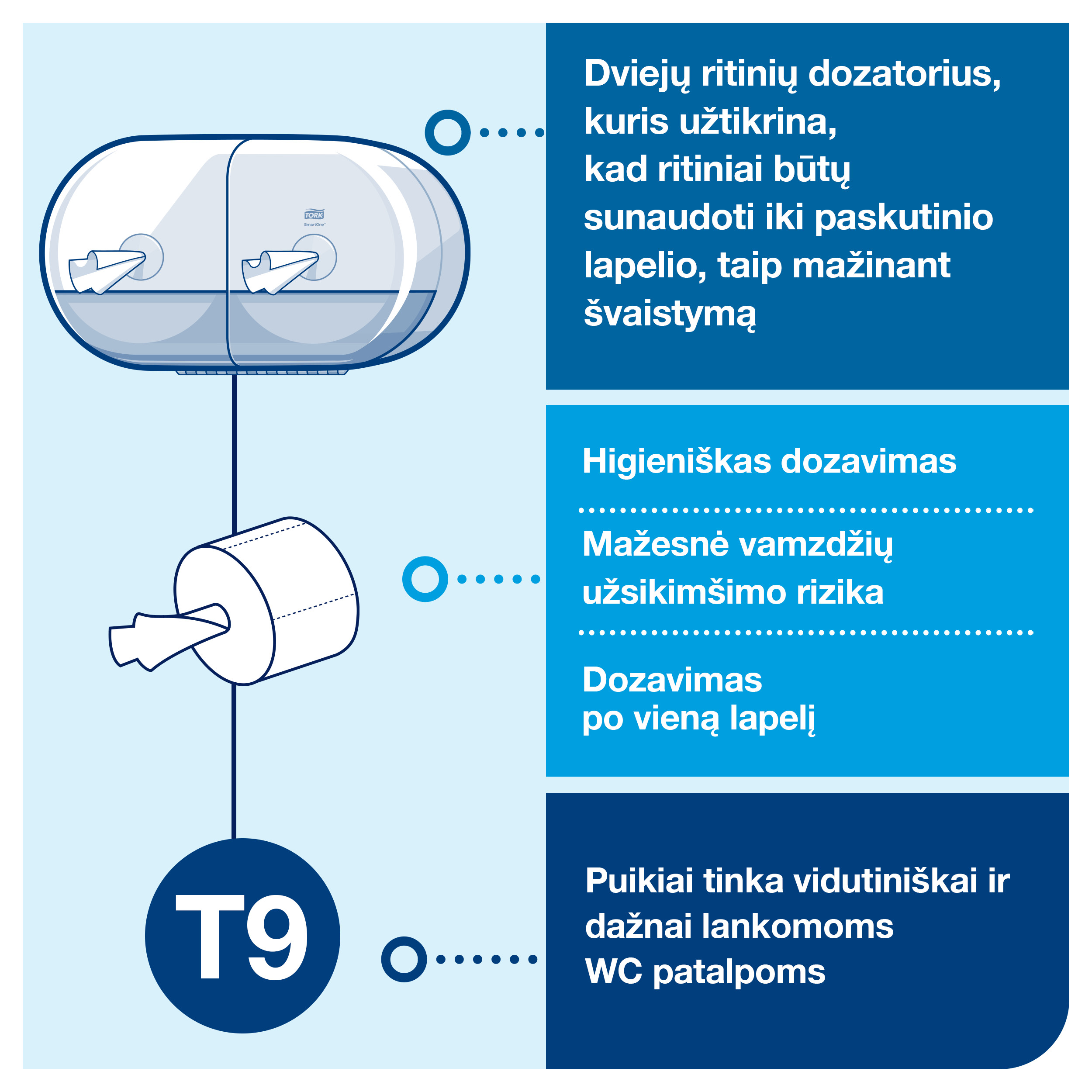 • Dozavimas po vieną lapelį padeda sumažinti tualetinio popieriaus naudojimą iki 40 %