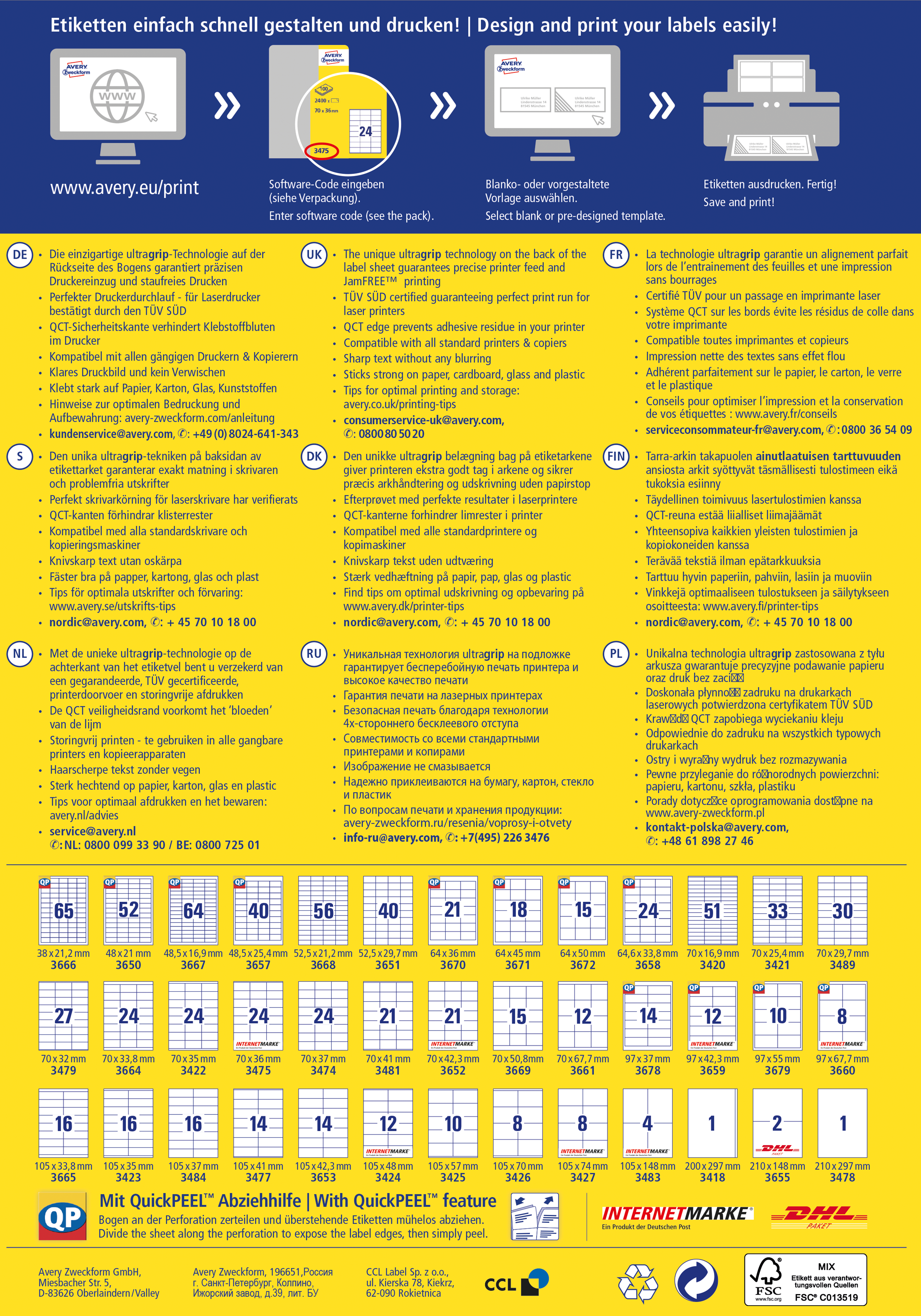• Lengvas dizainas: Naudokite nemokamus Avery Zweckform šablonus ir programinę įrangą iš www.avery-zweckform.eu/print arba integruotus „Microsoft® Office“ šablonus.