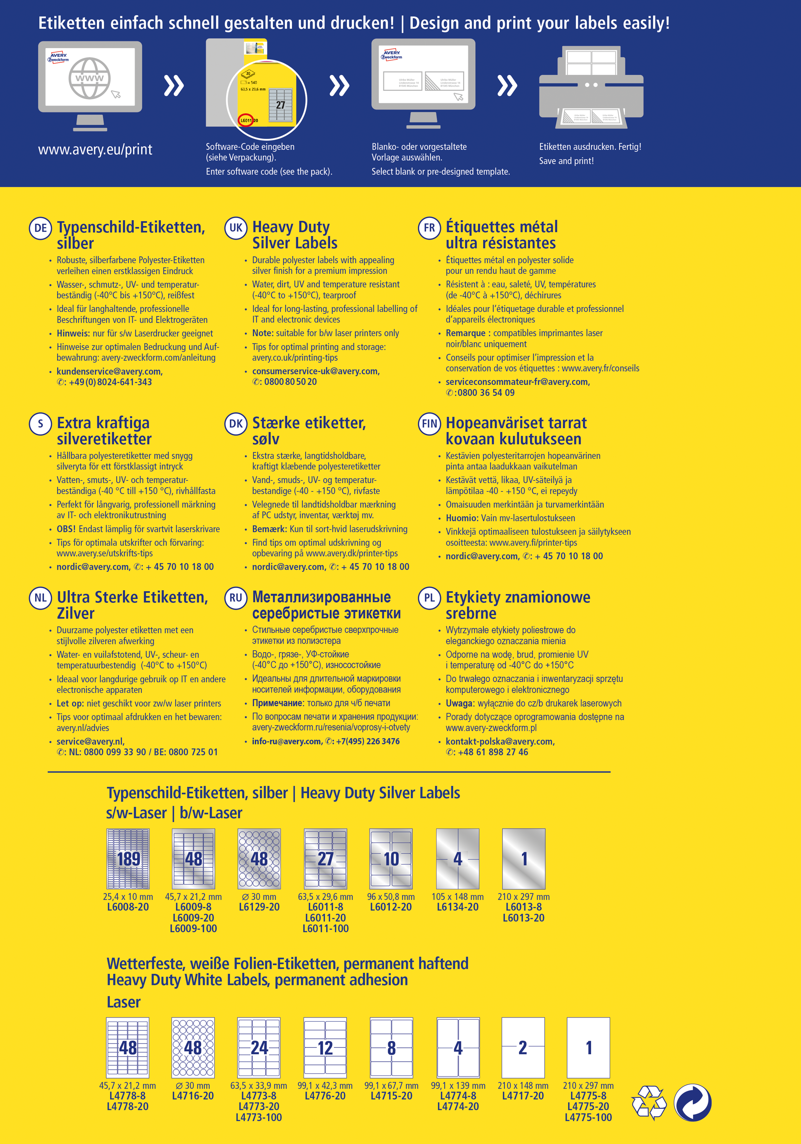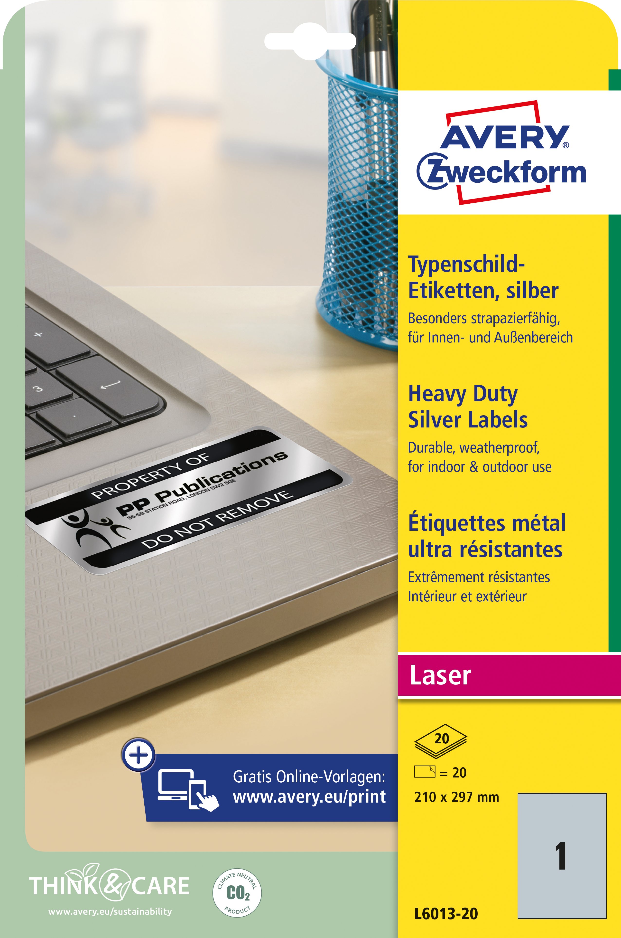 Avery Zweckform etiketės, sidabrinės etiketės, A4 etiketės, lazerinės etiketės, tvirtos etiketės, vandeniui atsparios etiketės, riebalams atsparios etiketės, pramoninės etiketės, 210x297mm etiketės, stiprios etiketės, aukštos kokybės etiketės, turto etiketės, prekių etiketės, L6013-20, poliesterio etiketės, 20 lapų etiketės, lipnios etiketės, ilgaamžės etiketės
