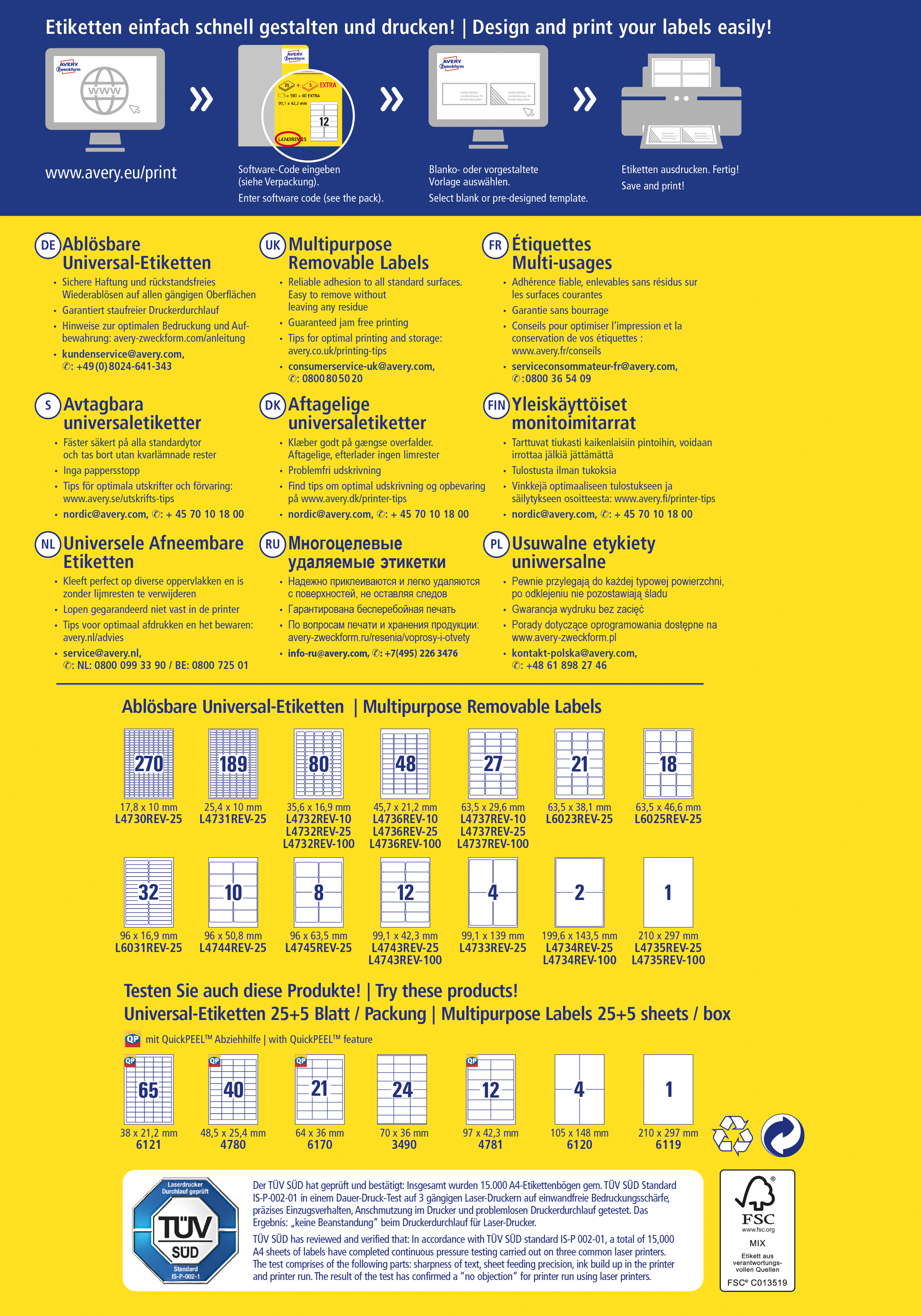Raktažodžiai: Avery Zweckform, etiketės, nuimamos etiketės, lipnios etiketės, L4732REV-25, A4, 35.6×16.9mm, žymėjimas, organizavimas, biuras, namai, mokykla, laikinos etiketės, aukštos kokybės etiketės, patogios etiketės, etiketės spausdintuvui, lazerinio spausdintuvo etiketės, rašalinio spausdintuvo etiketės, lengvai nuimamos etiketės, etiketės be likučių