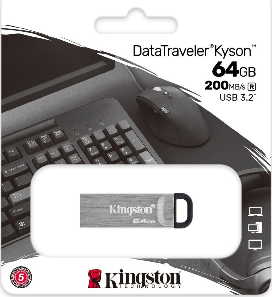 Kingston, DataTraveler, Kyson, USB blykstės atmintinė, 64GB, USB 3.2 Gen 1, greitas, patikimas, nešiojamas, patvarus, kompaktiškas, platus suderinamumas, 5 metų garantija, saugykla, duomenų perdavimas, atsarginė kopija, failai, dokumentai, nuotraukos, vaizdo įrašai, „Windows“, „macOS“, „Linux“, „Chrome OS“.