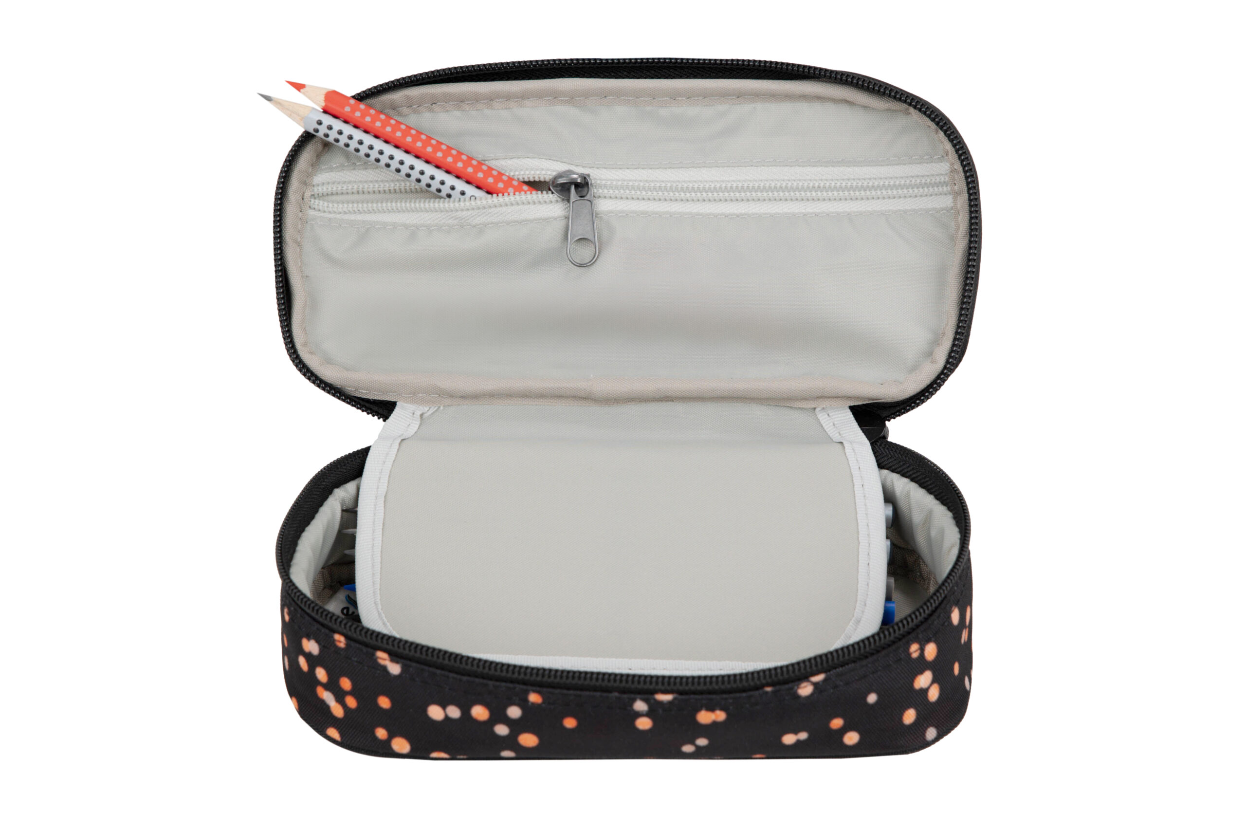 - Organizuotas dizainas: Specialūs elastinės tvirtai laiko iki 5 rašiklių/pieštukų, 1 trintuką ir 1 drožtuką. Užtrauktuku užsegamas skyrius suteikia papildomos vietos mažesniems daiktams.