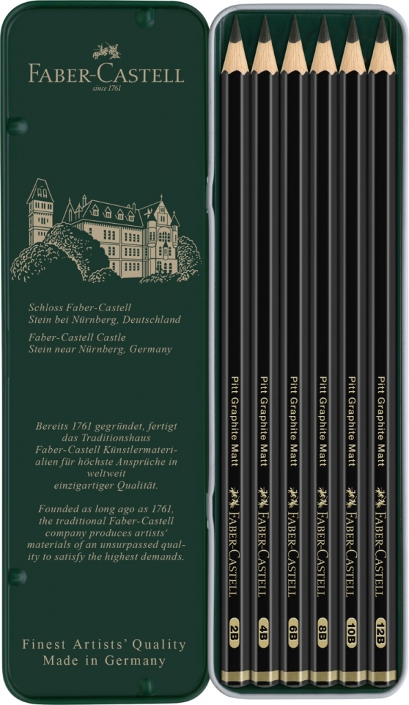 „Faber-Castell“ įsipareigojimas tvarumui atsispindi jų anglies neutralioje gamyboje, naudojant medieną iš sertifikuotų tvarių miškų ir aplinkai draugišką vandeninės bazės laką. Šis rinkinys siūlo platų kietumo laipsnių spektrą (2B, 4B, 6B, 8B, 10B, 12B), suteikdamas universalumą įvairioms piešimo technikoms ir šešėliavimo efektams, įkvepiant visų lygių menininkus tyrinėti savo kūrybinį potencialą švaria sąžine.