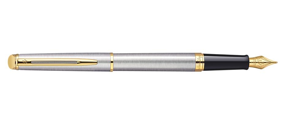 Plunksnakotis HEMISPHERE Stainless Steel, Nerūdijančio plieno korpusas, Ypatingas akcentas – dailus žiedelis, išgraviruotas WATERMAN užrašu, Apdailos detalės padengtos auksu, Plunksna (Fine storio) nulieta iš nerūdijančio plieno, padengta auksu, Plunksnakočiui naudojamos WATERMAN rašalo kapsulės arba pritraukimo mechanizmas,