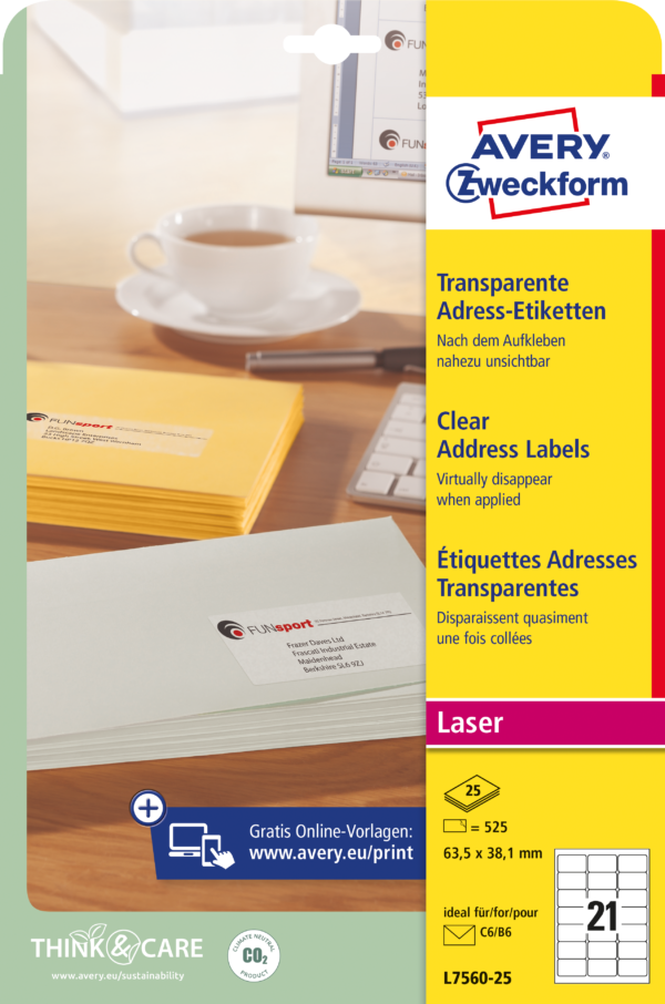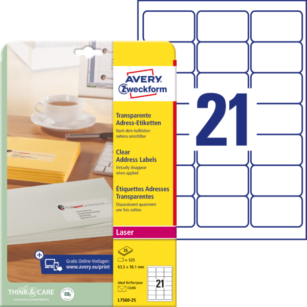 Raktiniai žodžiai: skaidrūs lipdukai, lipnios etiketės, lazeriniam spausdintuvui, Avery Zweckform, L7560-25, A4, 63.5×38.1 mm, prekių ženklinimas, failų organizavimas, lipdukai, žymės, etiketės prekėms, pakuotės etiketės, skaidrūs lipdukai, aukšta kokybė, universalios etiketės, gera kaina, pirkti etiketes.