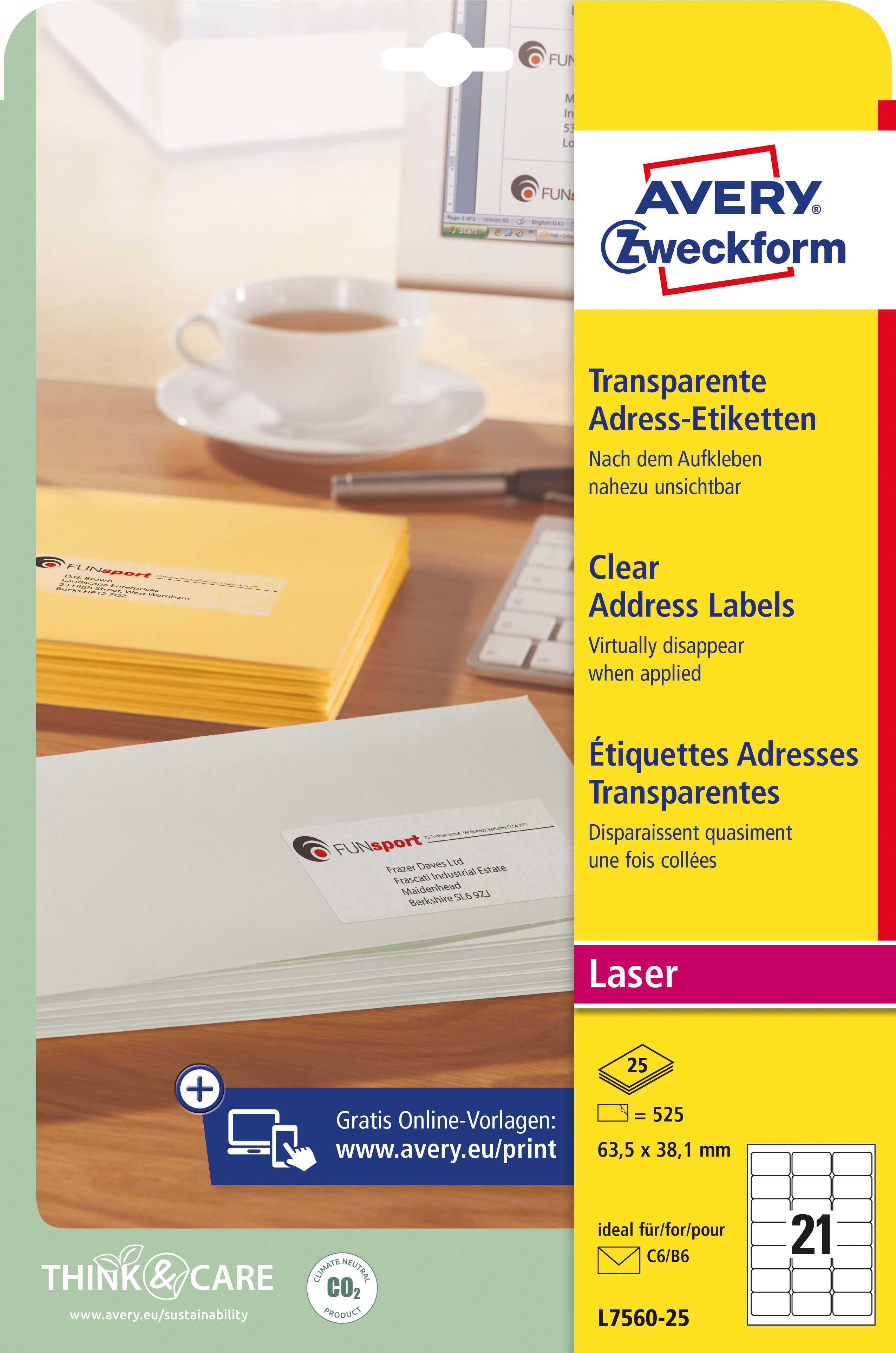 Skaidrūs lipnūs etikečių lapai Avery Zweckform L7560-25 – 525 vnt.