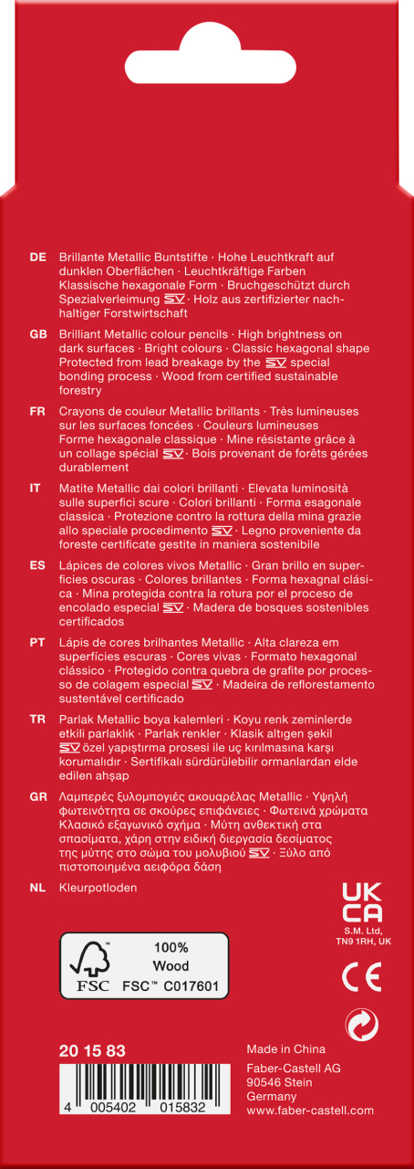 „Faber-Castell“ yra įsipareigojusi atsakingam gamtos išteklių naudojimui, todėl šių pieštukų gamybai naudojama mediena yra iš sertifikuoto, tvariai valdomo miškų ūkio. Patogi kartoninė pakuotė padeda išlaikyti jūsų 10 metalinių spalvotų pieštukų rinkinį tvarkingą ir apsaugotą, palengvinant jų nešiojimąsi ir laikymą. Tai puikus pasirinkimas norintiems pridėti unikalų, akį traukiantį efektą savo meniniams darbams.
