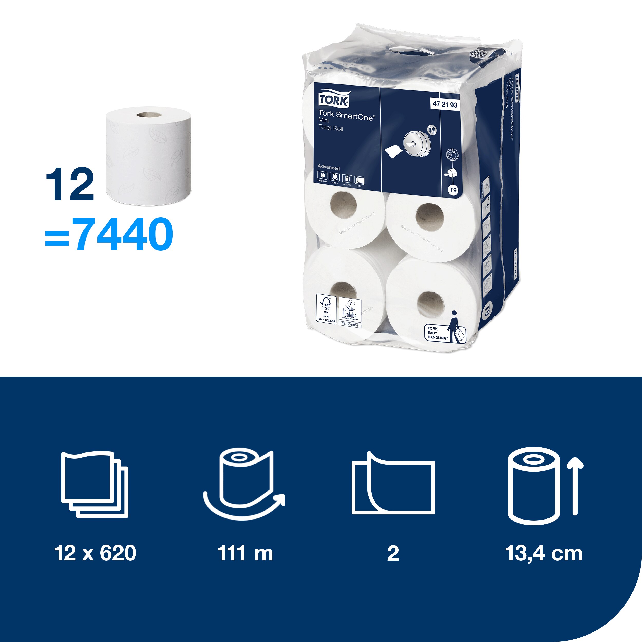 Tualetinis popierius Tork Smart One Mini T9 (472193), baltos spalvos, 2 sluoksniai, 620 lapelių, 111,6 m