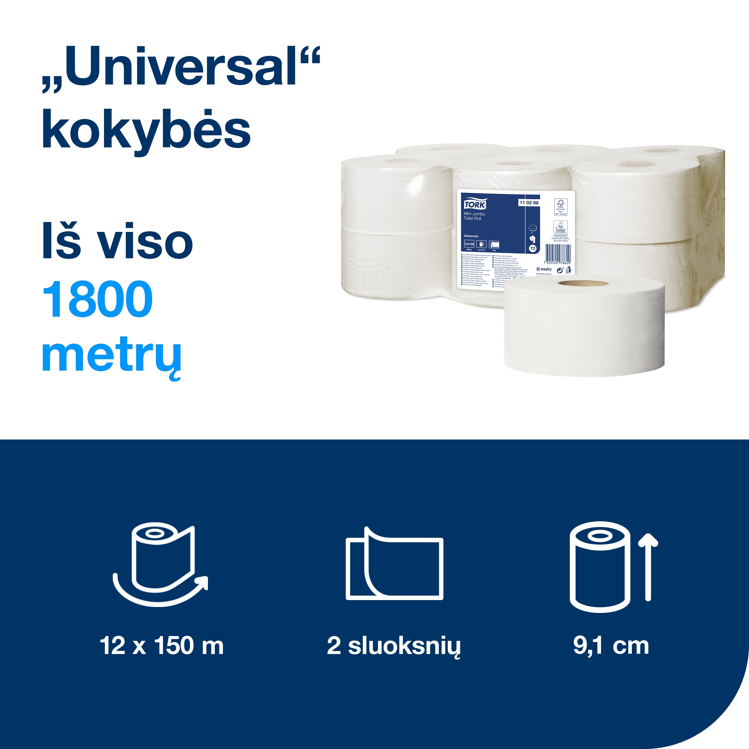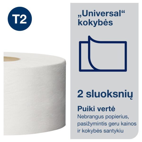 Tualetinis popierius Tork Universal Jumbo Mini T2, baltos spalvos, 110298, 2 sluoksniai, 150 m